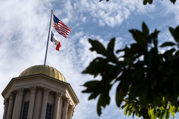 Background image: The University of Iowa celebrates its diversity by flying the flags of each country represented by a student on campus.